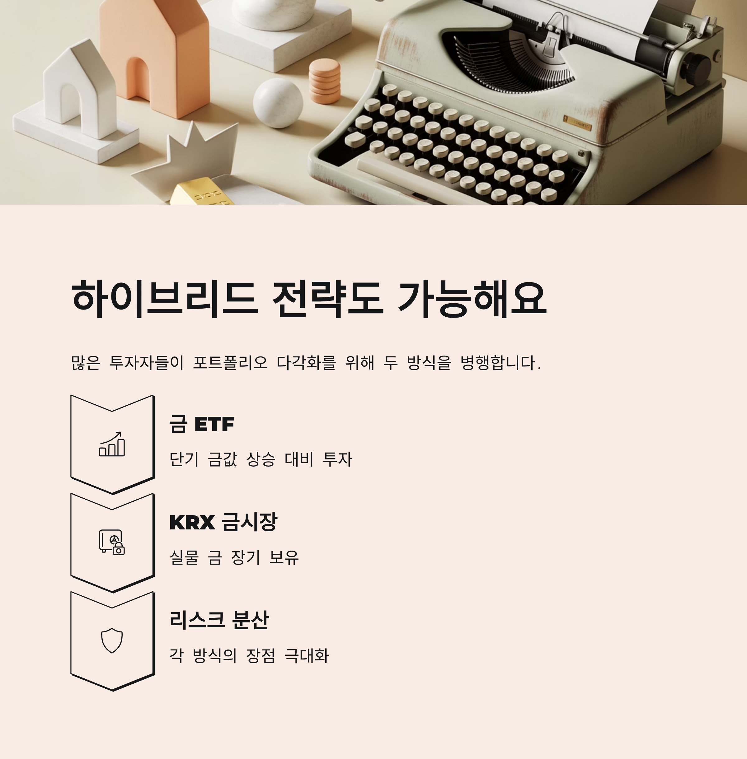 단기 수익을 노리거나 편리한 방식이 좋다면 ETF가, 인플레이션 대비나 위기 상황을 대비한 실물 자산 보유가 목적이라면 실물 금이 더 적합할 수 있어요.