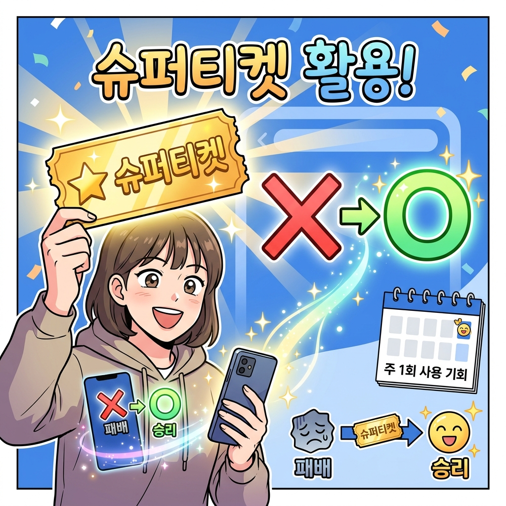 만약 아쉽게도 패배했을 경우를 대비해서 '슈퍼티켓'이라는 유용한 기능도 있어요. 슈퍼티켓을 사용하면 주 1회에 한해 패배를 승리로 변경할 수 있어요.