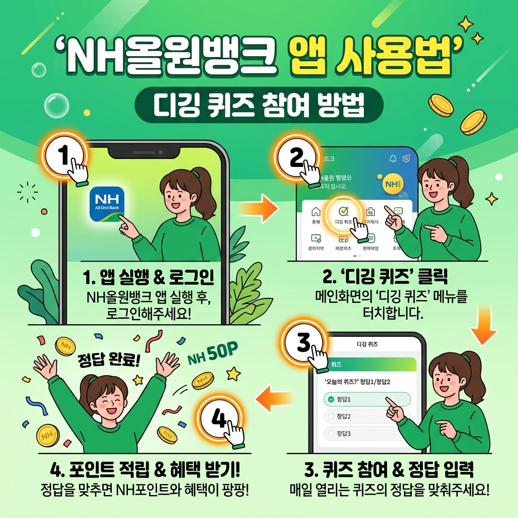 NH올원뱅크 디깅퀴즈는 간단한 문제 풀이로 포인트를 얻을 수 있어 많은 분이 참여하는 인기 앱테크 중 하나예요. 퀴즈를 맞히면 즉시 NH포인트가 적립되니, 바쁜 일상 속에서도 소소하게 용돈을 벌기 좋죠.